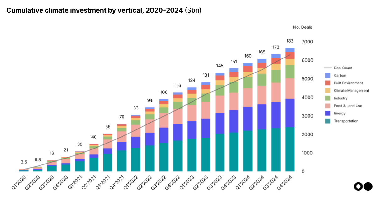 Energy saw a 12% rise to $9.4 billion, with nuclear and storage leading the charge. After declining to 19% of total energy investment in 2023, nuclear and storage rebounded to 38% in 2024.