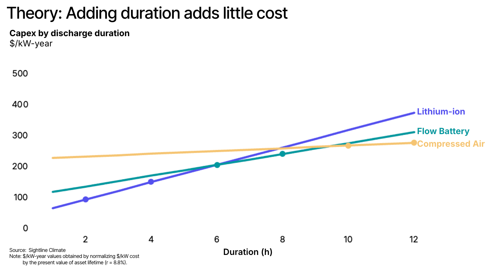 LDES sits at the center of the clean firm power debate. Inter-day (8-12 hour) storage could help grid operators manage winter peaks, reduce renewables curtailment, and support rising load from data centers. But emerging technologies are underperforming compared to the dizzying pace of innovation in the lithium-ion industry, preventing cost parity with the incumbent, let alone the cost declines that could make LDES a viable asset class. For example, the Stoney Creek long duration lithium-ion battery is cheaper upfront (on a lifetime- and degradation-normalized basis) than any emerging technology.