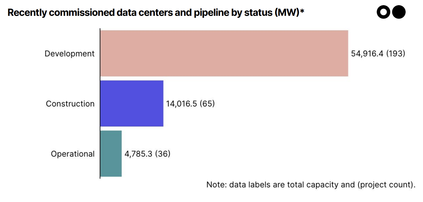 In our dataset, we’ve tracked 294 data center projects weighing-in at 73.6GW demand. The pipeline is constantly evolving with new projects announced basically every day — we’re tracking those too 🤓. Over 8.9GW across 105 projects in the pipeline are targeting operation by end-2026, with 47 already under construction.