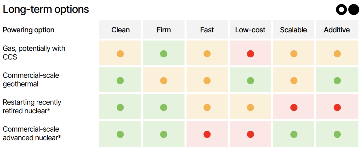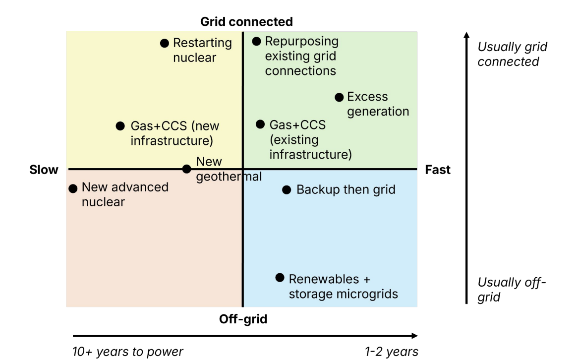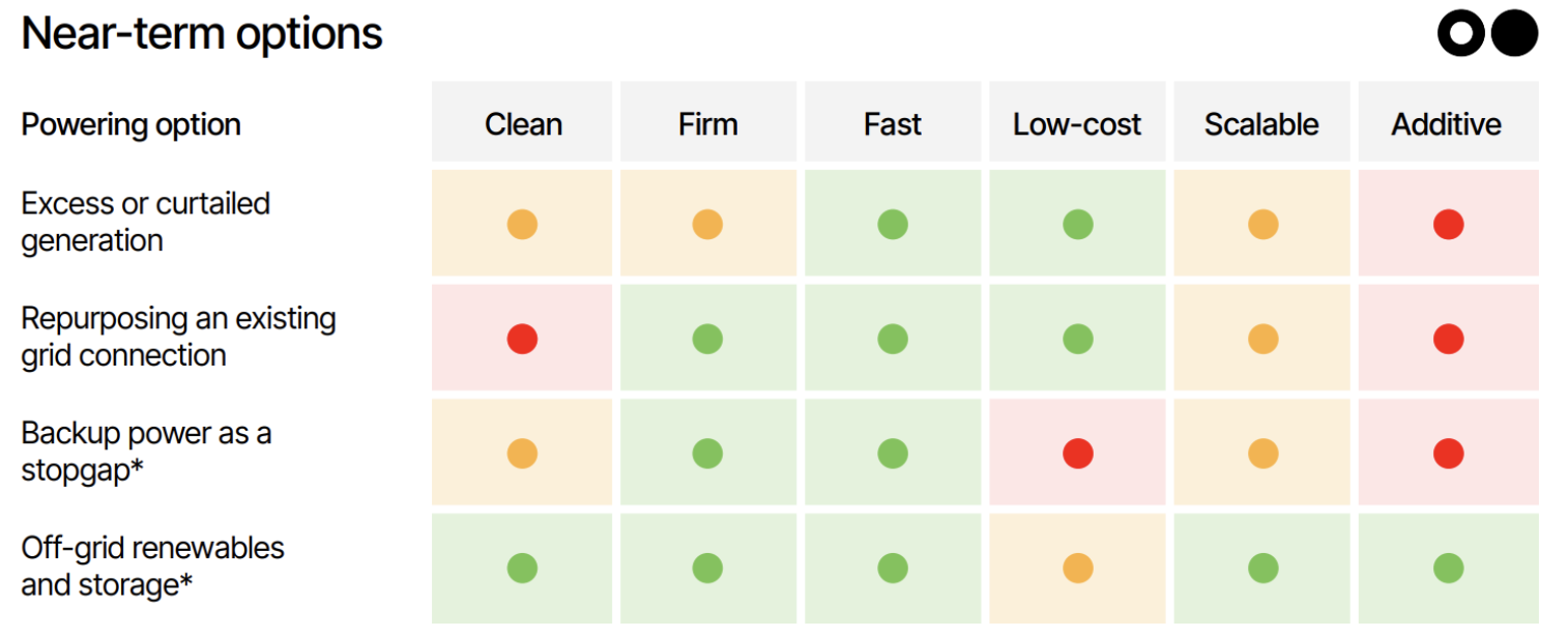 That’s why today’s builds tend to look the same: fast, firm, and often gassy. Gas is the default and backup power buys time, while some developers can repurpose coal plant connections or plug into regions with excess nuclear or renewables.