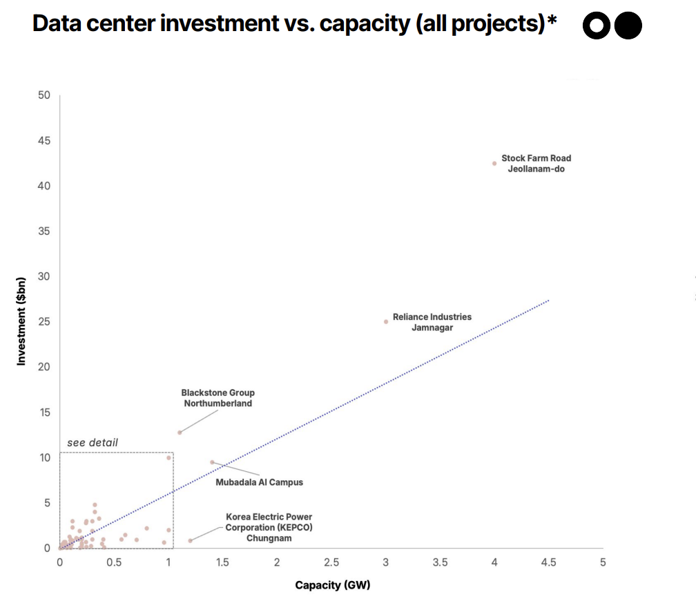 Meanwhile, geographic diversification is accelerating, with more activity in Asia and Europe — particularly as US grids get congested. The US leads with 106 announced sites, while mega-projects in the UK and France signal a wave of strategic AI infrastructure in Europe and Asia. Plus, 15 announced projects globally exceed 1GW capacity as AI drives demand for hyperscale buildouts, aka facilities designed for cloud, big data, and AI workloads. Next-gen centers optimized for AI training and inference are central to this wave. In fact, 5 projects top 3GW, with hundreds of billions in investment at stake.